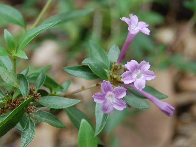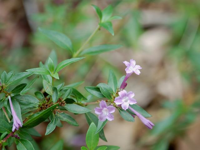 枝先や葉の脇に花径10~15ミリくらいの小さな淡い紫色の花をつける。