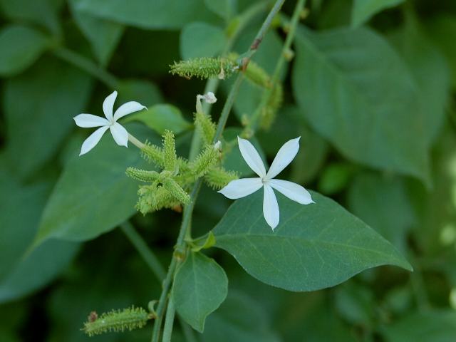 枝先に集散花序(最初の花が枝先につき、その下に次々と側枝を出して花がつく)を出し、細い漏斗状の白い花をつける。