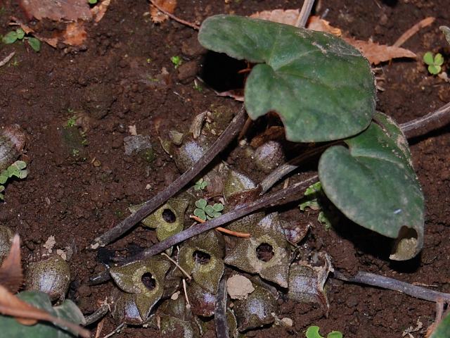 属名の Asarum はギリシャ語の「asaron(枝を打たぬ)」からきているが、関係は不明だという。