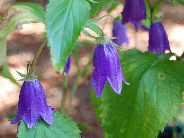 茎先に淡い青紫色をした鐘状の花を下向きないし横向きにつける。