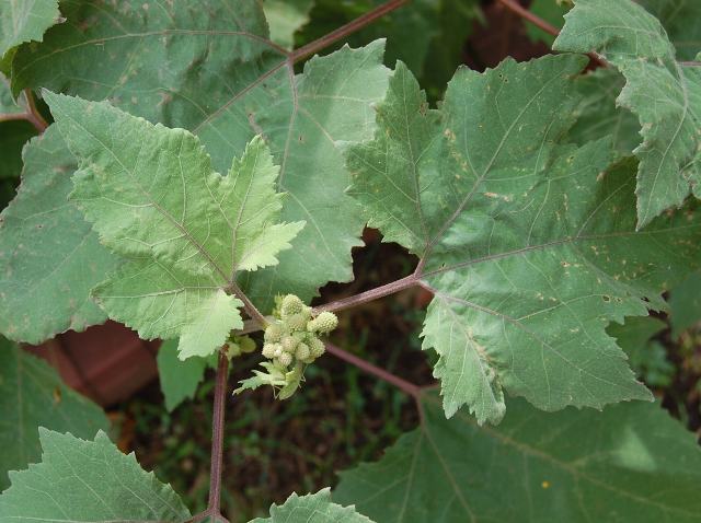 葉は3つから5つに中ほどまで裂け、縁に不揃いの粗いぎざぎざ(鋸歯)がある。