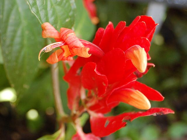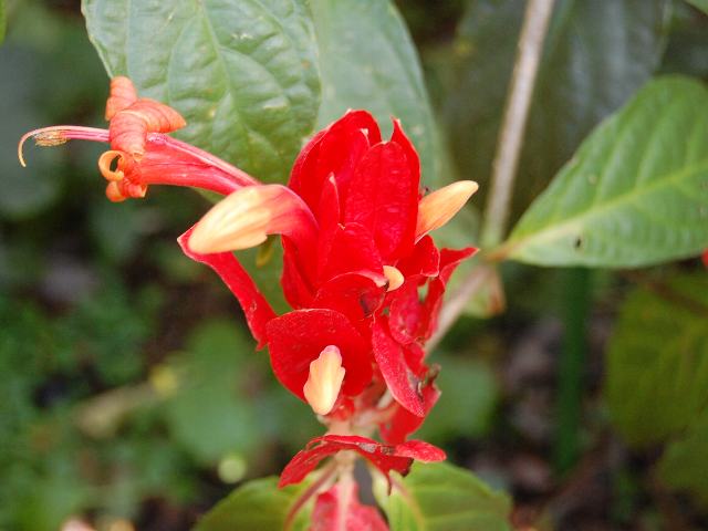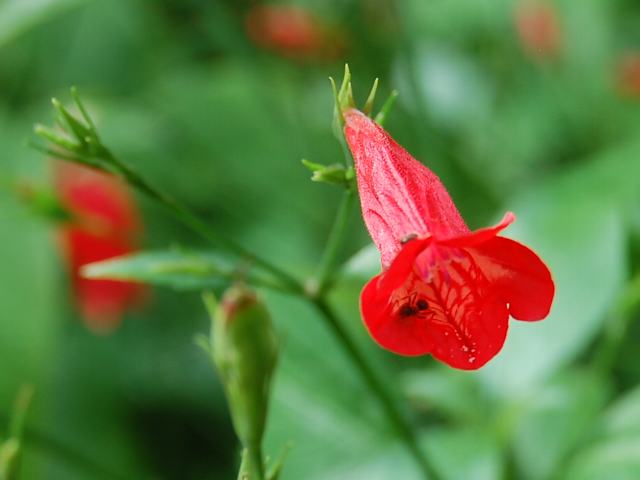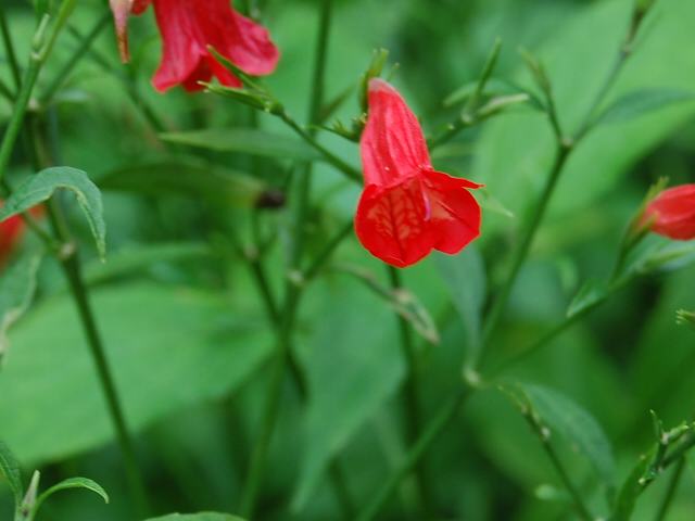 葉の脇から花茎を伸ばし、赤い筒状の花をつける。