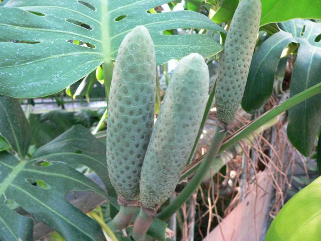 実は円筒形で、バナナやパイナップルに似た味がして食用になるが、一般にはあまり流通していない。