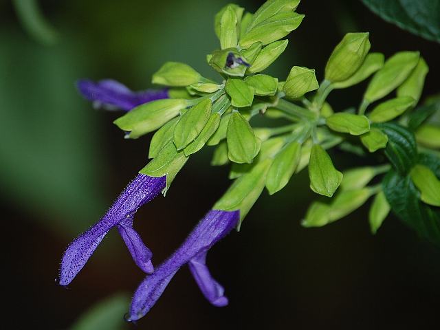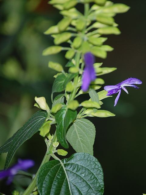 茎先に穂状の総状花序(柄のある花が花茎に均等につく)を出し、濃い紫色をした唇形の花をたくさんつける。