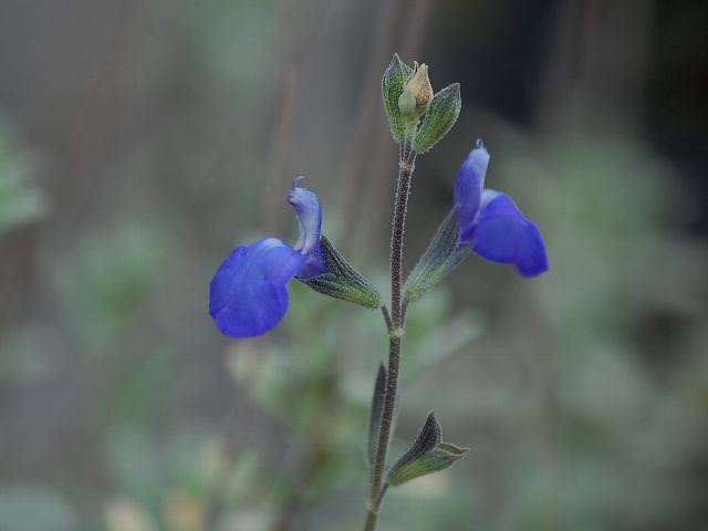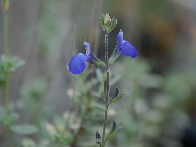 茎先に総状花序(柄のある花が花茎に均等につく)を出し、鮮やかなスカイブルーの唇形の花をつける。