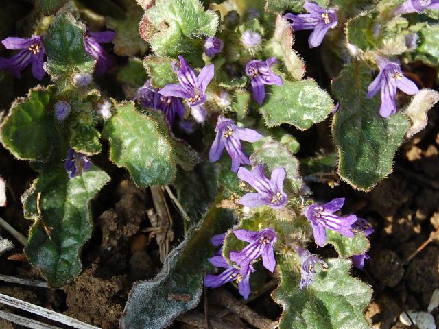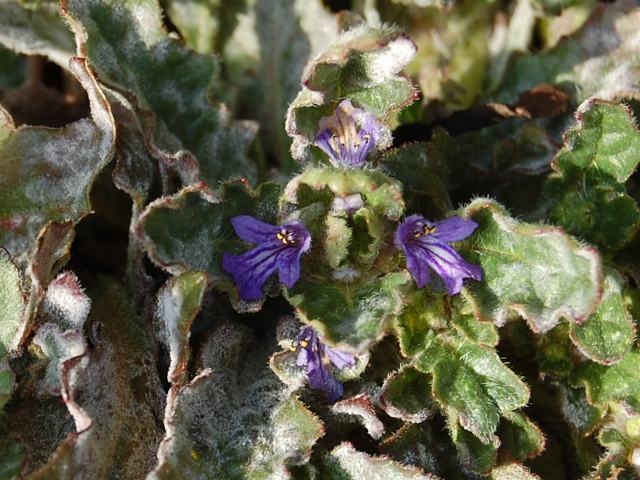 30センチくらいになる茎を数本横に伸ばし、濃い紫色をした唇形の花を咲かせる。