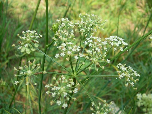 茎先に複散形花序を出し、白い小さな花をたくさんつける。