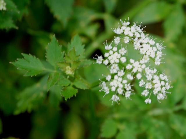 茎先に複数の散形花序(枝先に1個つずつ花がつく)を出し、白い小さな花を10~20個くらいずつつける。