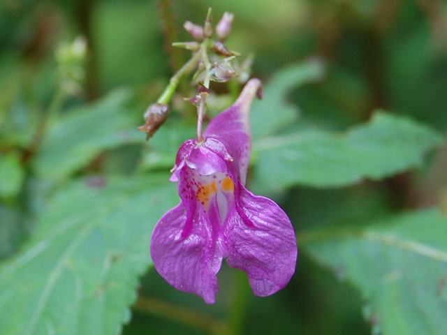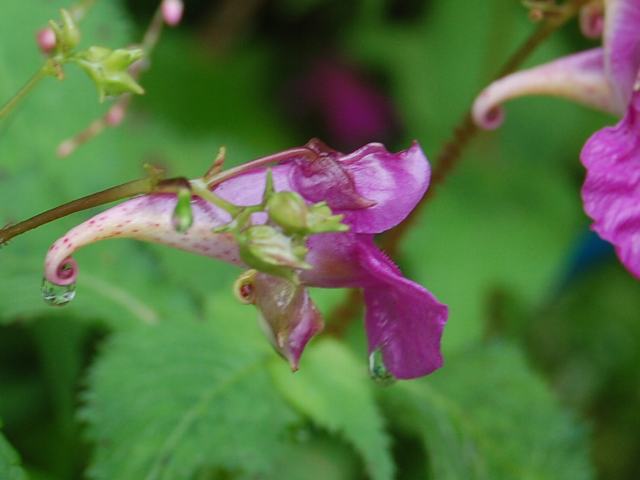 属名の Impatiens はラテン語の「impa(否定)+tient(忍耐)」からきている。「我慢できない」という意味で、さく果にさわると急に弾けることから名づけられた。