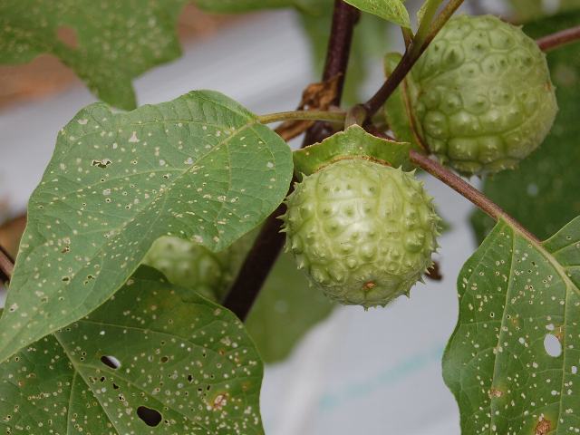 花の後にできる実は球形のさく果(熟すると下部が裂け、種子が散布される果実)で、短い棘がたくさん生える。