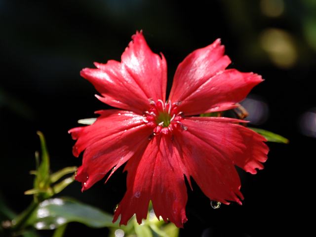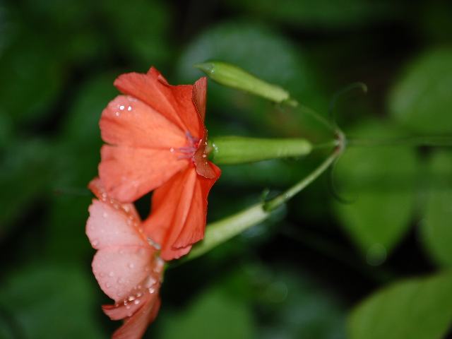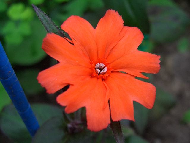 茎先に花径5センチくらいの朱色の5弁花をつける。