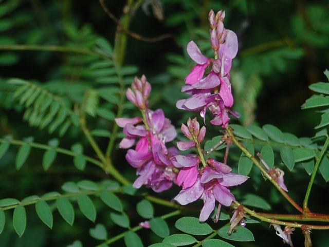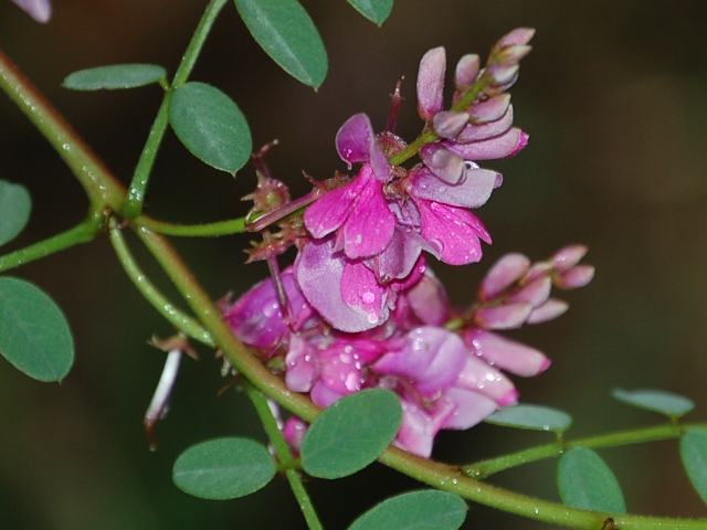 葉の脇から総状花序(柄のある花が花茎に均等につく)を出し、淡い紅紫色をした蝶形の花をたくさんつける。
