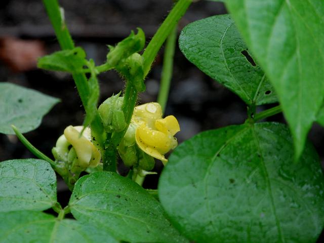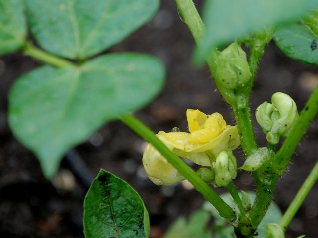 葉の脇に淡い黄色の蝶形の花を3~10個くらいつける。