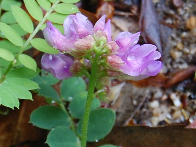 葉の脇から短い総状花序(柄のある花が花茎に均等につく)を直立させ、淡い紅紫色をした蝶形の花をつける。