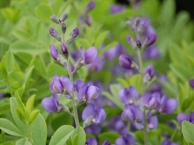 茎先に総状花序(柄のある花が花茎に均等につく)を出し、青紫色をした蝶形の花をつける。