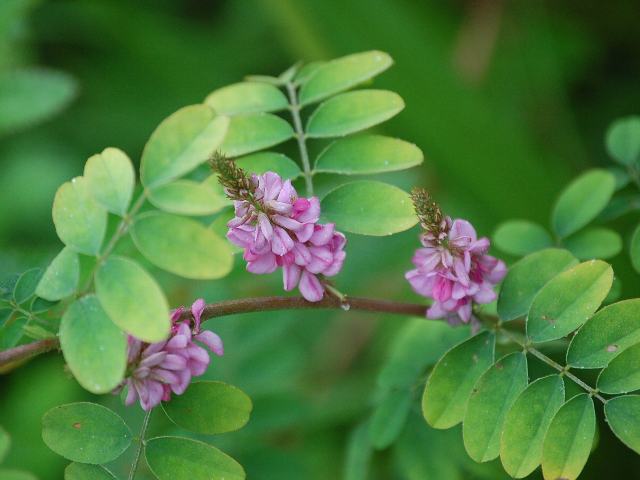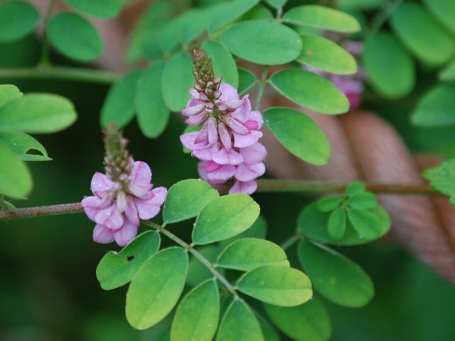 葉の脇から円錐花序(下のほうになるほど枝分かれする回数が多く、全体をみると円錐形になる)を出し、淡い紅紫色ないし白の蝶形をした花を開く。