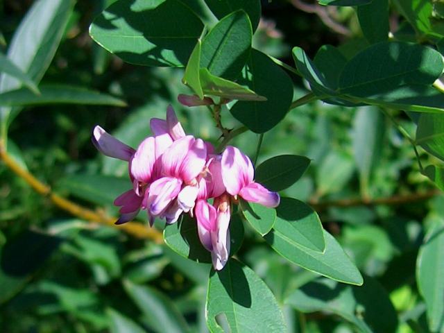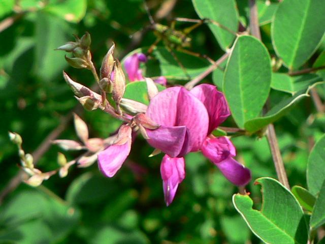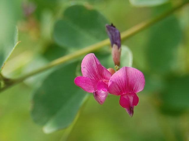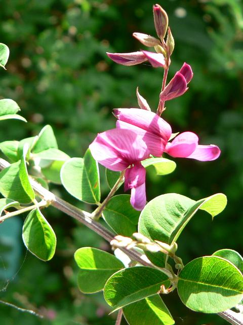 枝先の葉の脇から総状花序(柄のある花が花茎に均等につく)を出し、紅紫色をした蝶形の花をつける。