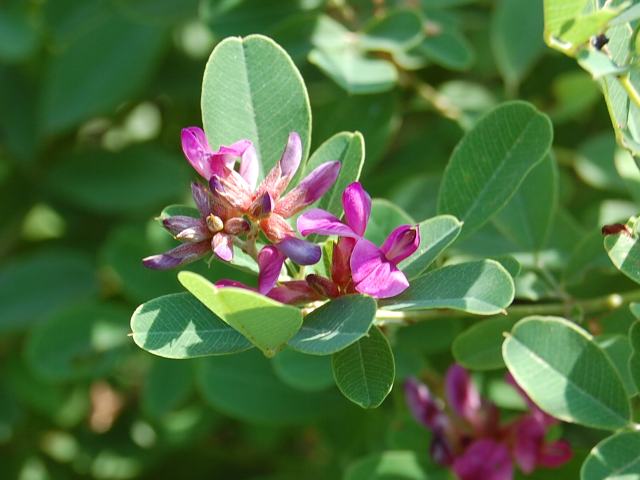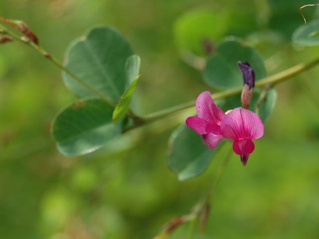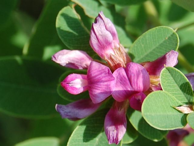 葉の脇に短い総状花序(柄のある花が花茎に均等につく)を出し、紅紫色の蝶形をした花をかたまってつける。