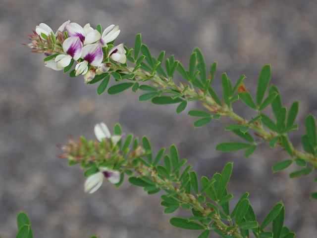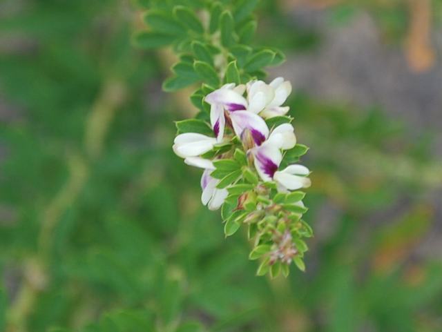葉の脇に長さ6ミリくらいの蝶形の花を数個ずつつける。