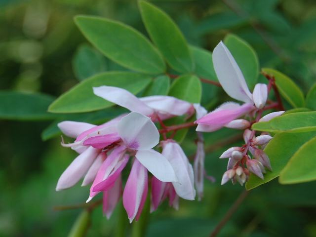 葉の脇に総状花序(柄のある花が花茎に均等につく)を出し、淡い紅色の蝶形の花をつける。