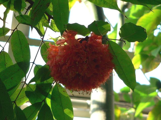 花の色は朱赤色で、石楠花(シャクナゲ)に似た感じでボール状に集まってぶら下がる。