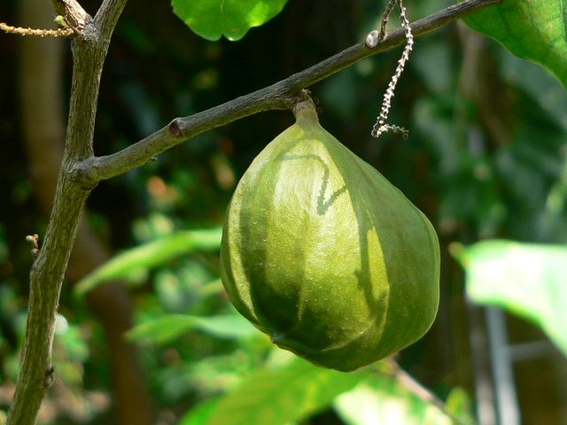 実は直径10センチくらいの卵形で、堅い莢の中に大きな種子がある。