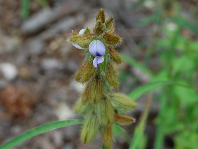 茎先に穂状花序(柄のない花が花茎に均等につく)を出し、青紫色をした蝶形の花をつける。