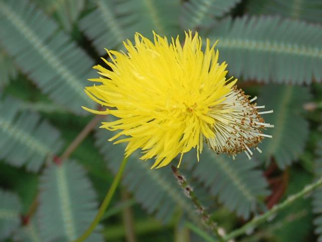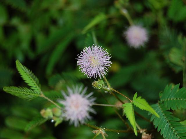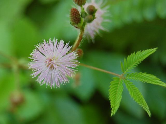 お辞儀草(オジギソウ)の名は、触れると葉を閉じて葉柄も下に垂れることからきている。