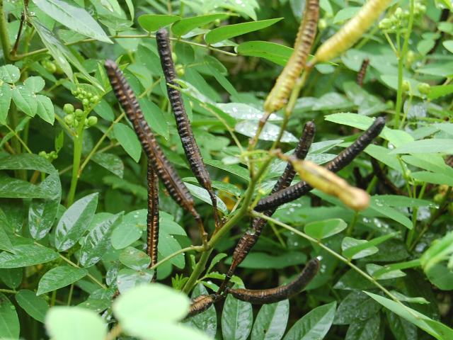 花の後にできる実は扁平な長い楕円形をした豆果(莢の中に種子が入るもの)で、暗い褐色に熟する。