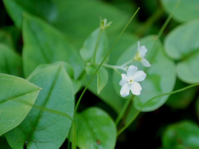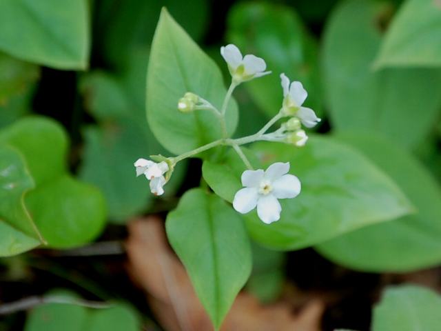 枝先の花序に花径7~10ミリくらいの白または薄い青紫色の花をたくさんつける。