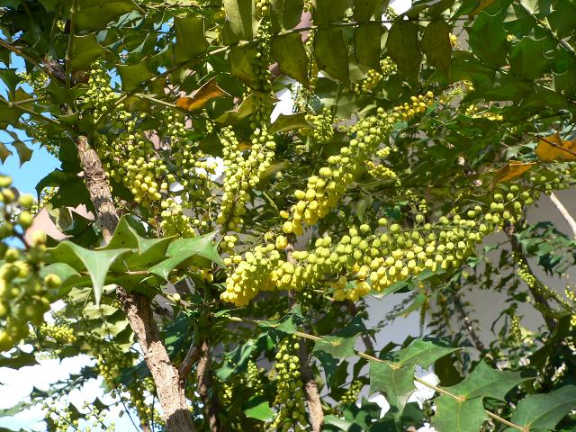 特徴としては、柊南天(ヒイラギナンテン)よりも開花時期が早く、花穂が立って豪華である。