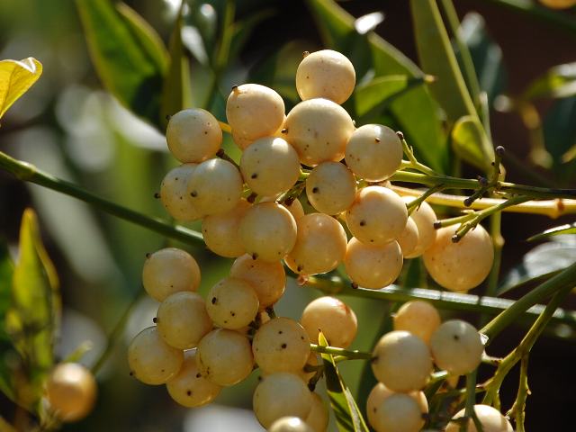 実は球形の液果(果皮が肉質で液汁が多い実)で、白く熟する。