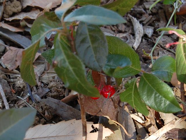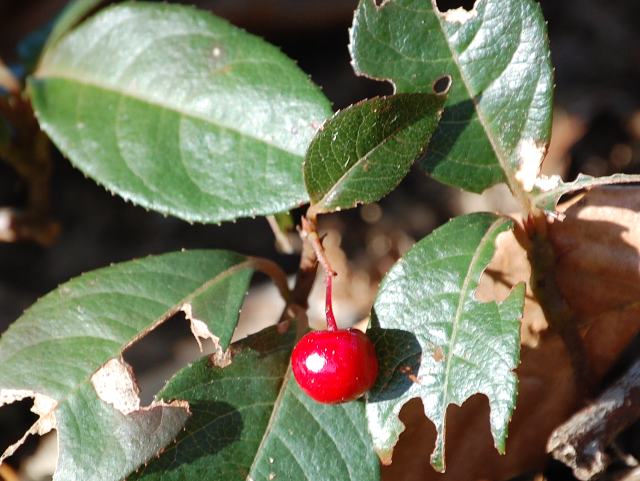 花の後にできる実は球形の液果(果皮が肉質で液汁が多い実)で、秋に赤く熟し、翌春まで木についている。