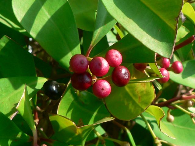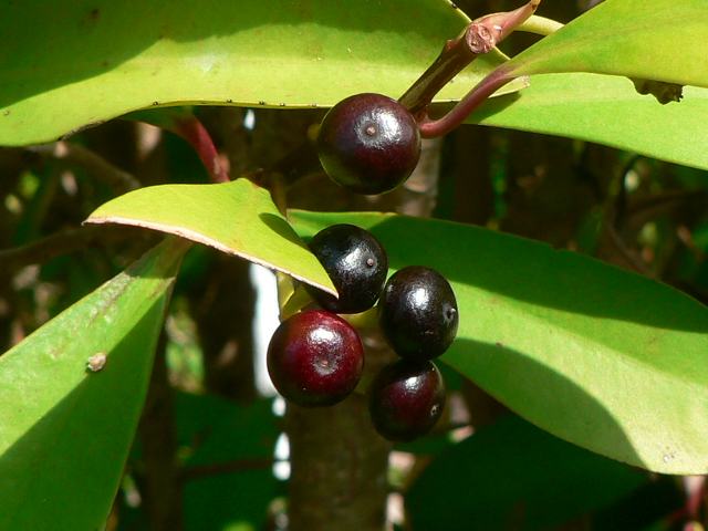 花の後にできる球形の実は赤から赤紫へと変化し、熟すと黒くなる。