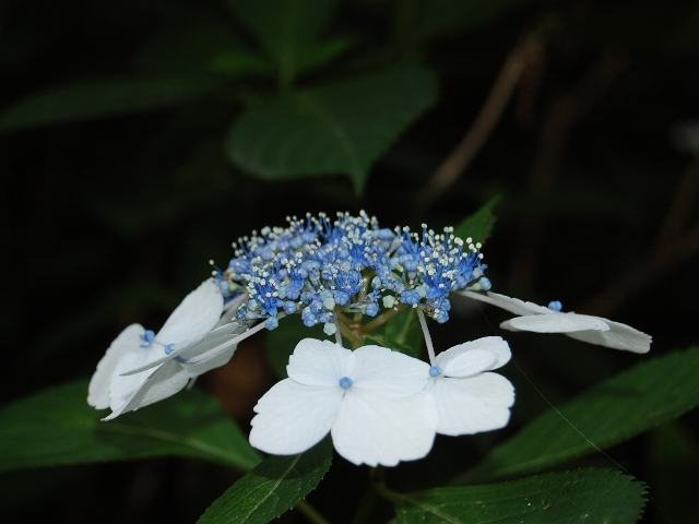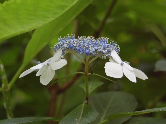 花序の中央部は両性花で、花径1センチにも満たない青白い五弁花が集まる。