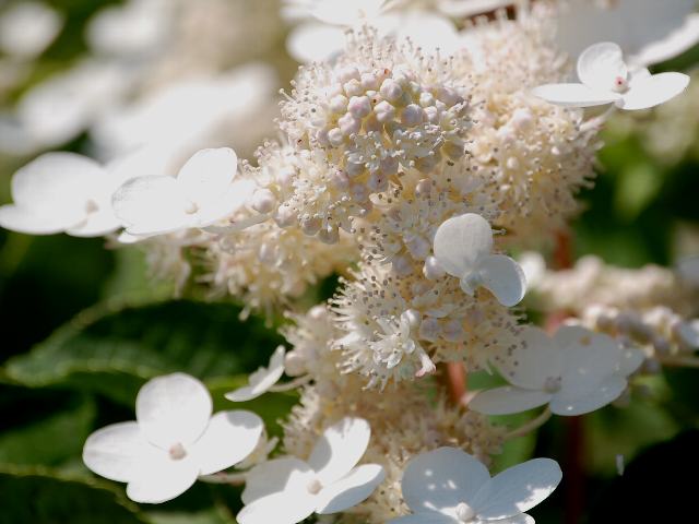 大きな円錐花序(下のほうになるほど枝分かれする回数が多く、全体をみると円錐形になる)を出して白い両性花をたくさんつけ、周囲に数個の装飾花をつける。