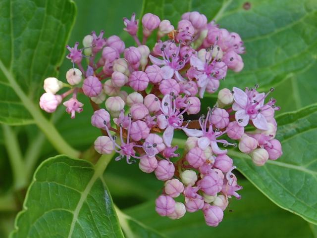真ん中に両性花が集まり、萼片4~5枚からなる装飾花を周囲につける。