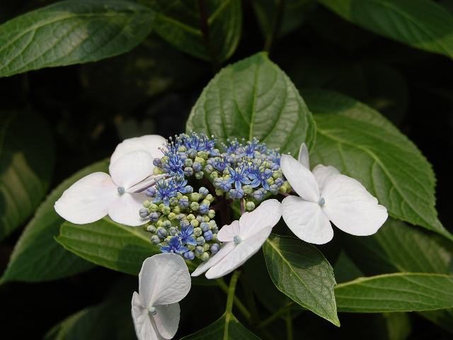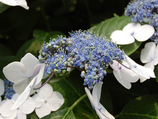山紫陽花(ヤマアジサイ)との違いは、(1)両性花が退化していて花が咲く前に落ちてしまうことと、(2)装飾花が重弁化していることである。
