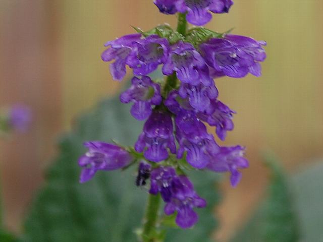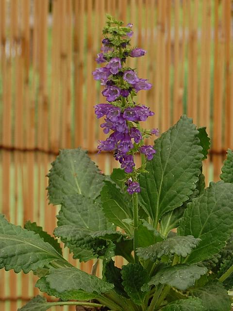 茎先に穂状の総状花序(柄のある花が花茎に均等につく)を出し、暗い青紫色をした唇形の花をたくさんつける。