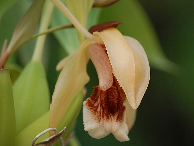 花茎を下垂させて、花径7~8センチの淡い黄褐色の花をつける。