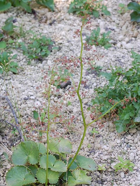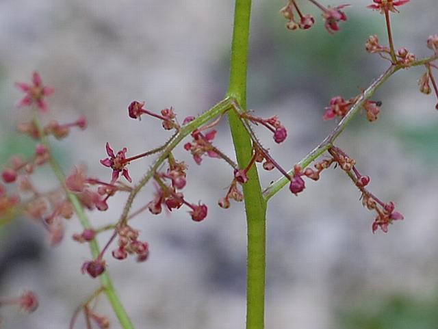 茎先に(下のほうになるほど枝分かれする回数が多く、全体をみると円錐形になる)を出し、花径6~8ミリくらいの小さな赤褐色の5弁花をまばらにつける。