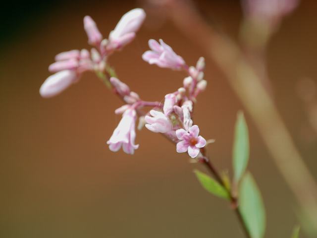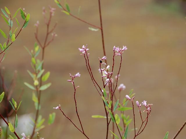 茎先に集散花序(最初の花が枝先につき、その下に次々と側枝を出して花がつく)を出し、淡い紅色の花をつける。