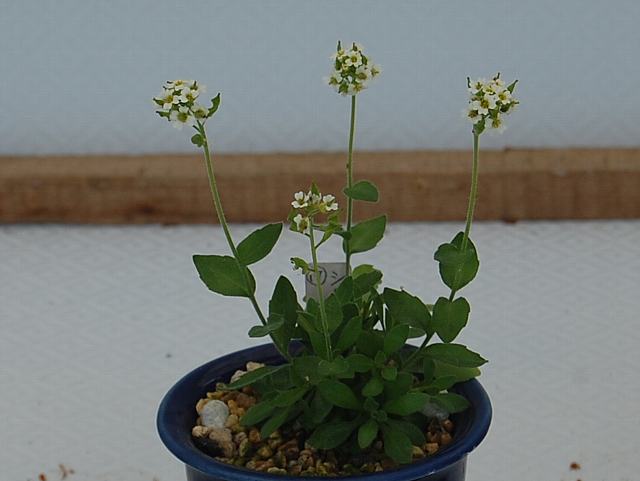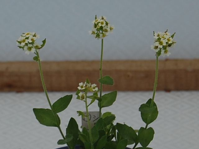 茎先に総状花序(柄のある花が花茎に均等につく)を出し、白い小さな4弁花をつける。