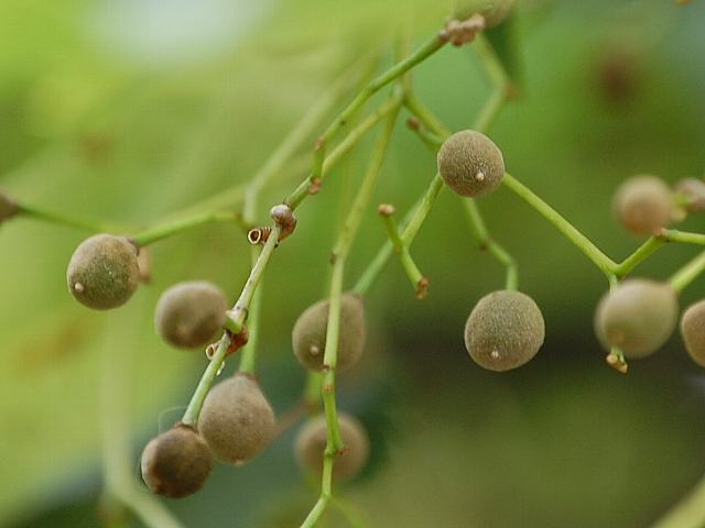 花の後にできる実は直径1センチくらいの球形の液果(果皮が肉質で液汁が多い実)で、黒紫色に熟する。