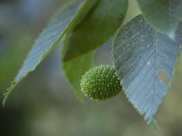 花の後にできる実は堅果(皮が堅く、種と接触せずに種を包んでいる果実)で、松かさ状となる。