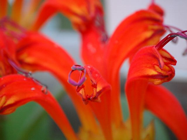 茎先に散形花序(たくさん枝が出て、先に1個つずつ花がつく)を出し、赤橙色の筒状花をつける。