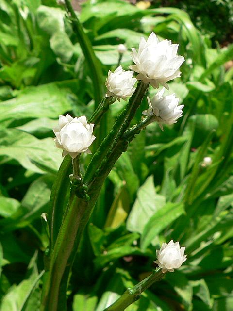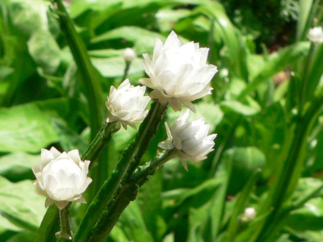 花(頭花)は白い花弁のように見える紙状の総苞に包まれている。