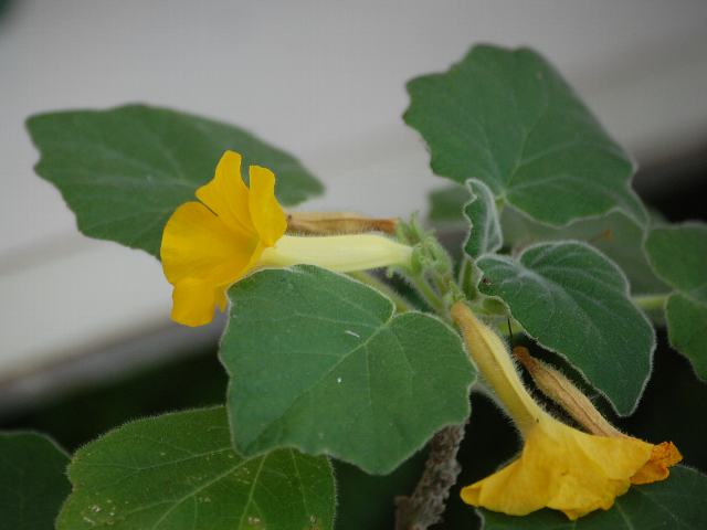 葉の脇に唇形をした黄色い花をつける。