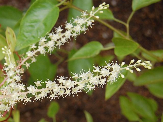 葉の脇から総状花序(柄のある花が花茎に均等につく)を出し、白い花をつける。