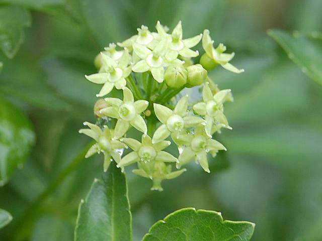 枝先に散形花序(枝先に1個つずつ花がつく)を出し、緑色の小さな花をたくさんつける。